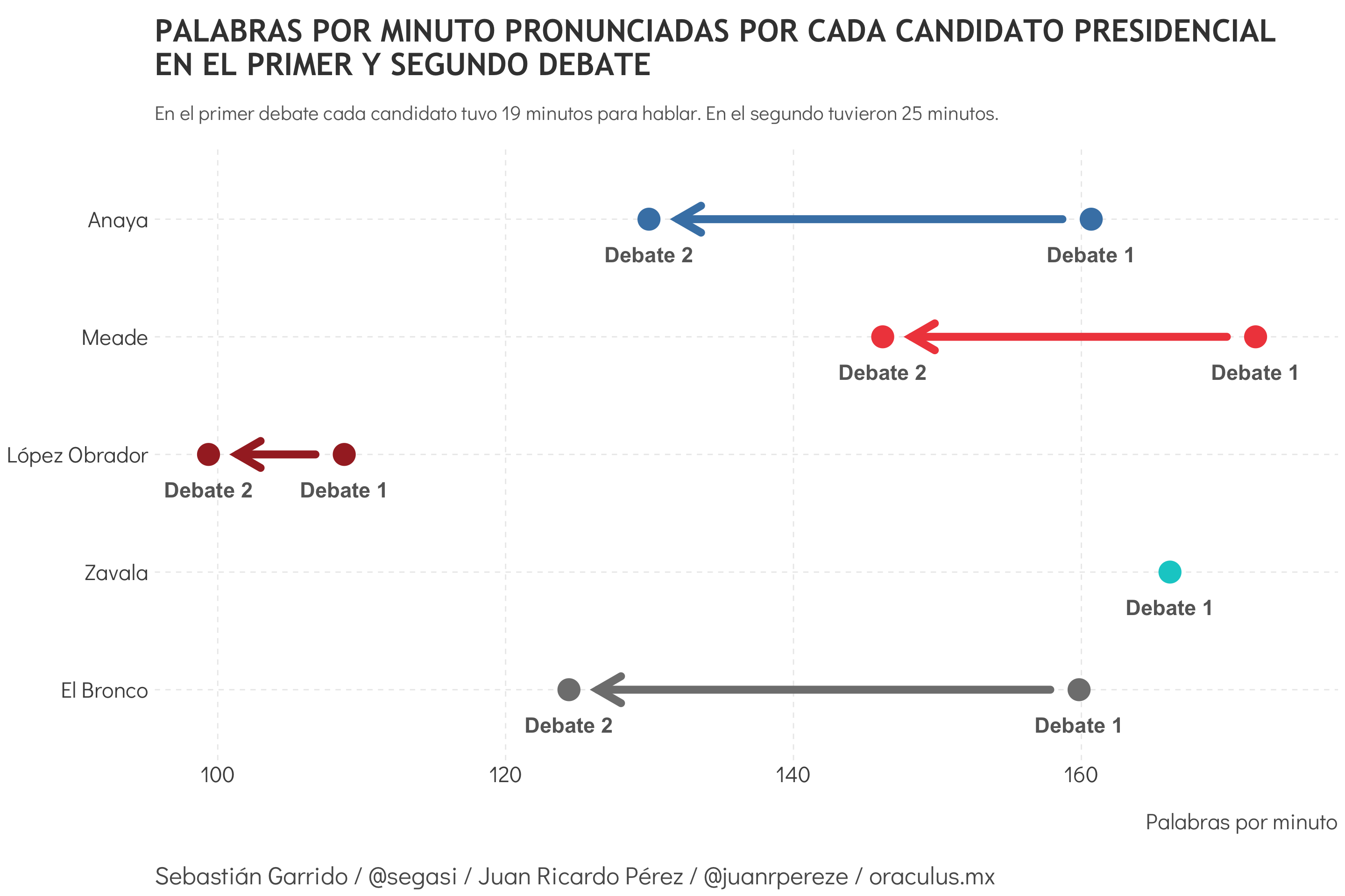 Pero si se considera el número de palabras por minuto pronunciadas por cada candidato en uno y otro debate, los datos indican que la eficiencia de los cuatro presidenciables fue notablemente menor. El Bronco fue quien registró la mayor caída: pasó de 160 palabras por minuto en el primer debate, a 124 en el segundo. Le siguen Ricardo Anaya (de 161 a 130 palabras por minuto) y Meade (de 172 a 146). Si bien López Obrador fue el candidato con la menor disminución (pasó de 109 a 99 palabras por minuto), también es el candidato que tuvo el menor número de palabras por minuto en el primer debate.1