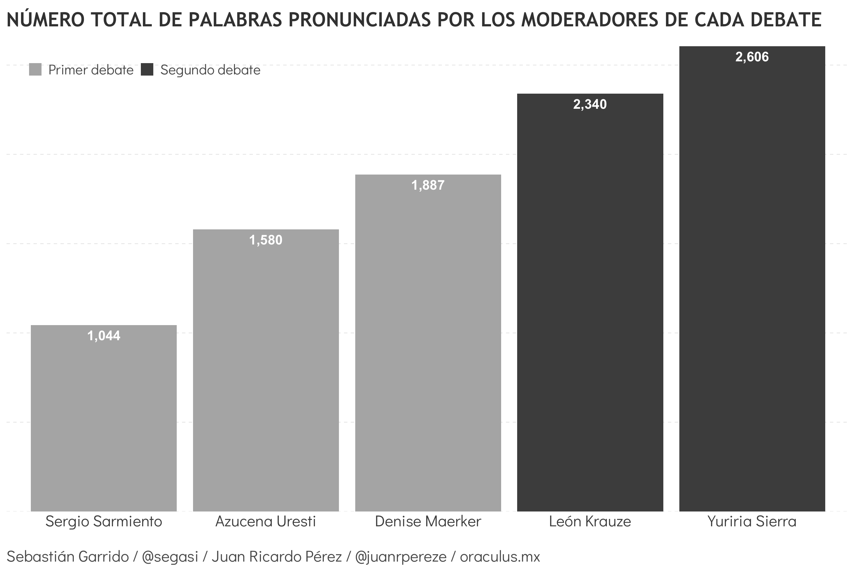 Sin embargo, los datos sugieren que el factor más importante fue la actuación de los moderadores del segundo debate. Mientras que Yuriria Sierra pronunció 2,606 palabras, León Krauze dijo 2,340. Puesto en términos comparados, Sierra y Krauze mencionaron más palabras que Sergio Sarmiento (1,044), Azucena Uresti (1,580) y Denise Maerker (1,887), tanto de forma individual como conjunta (4,946 vs. 4,511).