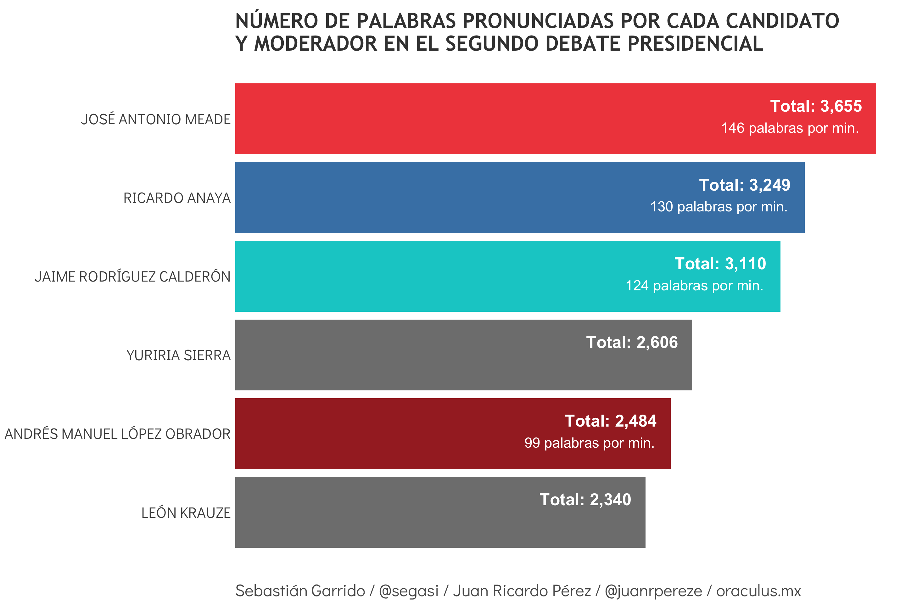 Los cuatro candidatos presidenciales que aún están en la carrera dijeron más palabras que en el primer debate. En un extremo, José Antonio Meade, candidato de la coalición Todos por México, pronunció 3,655 palabras (385 más que en el primer debate). En el otro, Andrés Manuel López Obrador, abanderado de la coalición Juntos Haremos Historia, dijo 2,484 palabras (417 más que en el primero). En medio están Ricardo Anaya, de la coalición Por México al frente (3,249 palabras) y el candidato independiente Jaime Rodríguez, El Bronco (3,110 palabras).