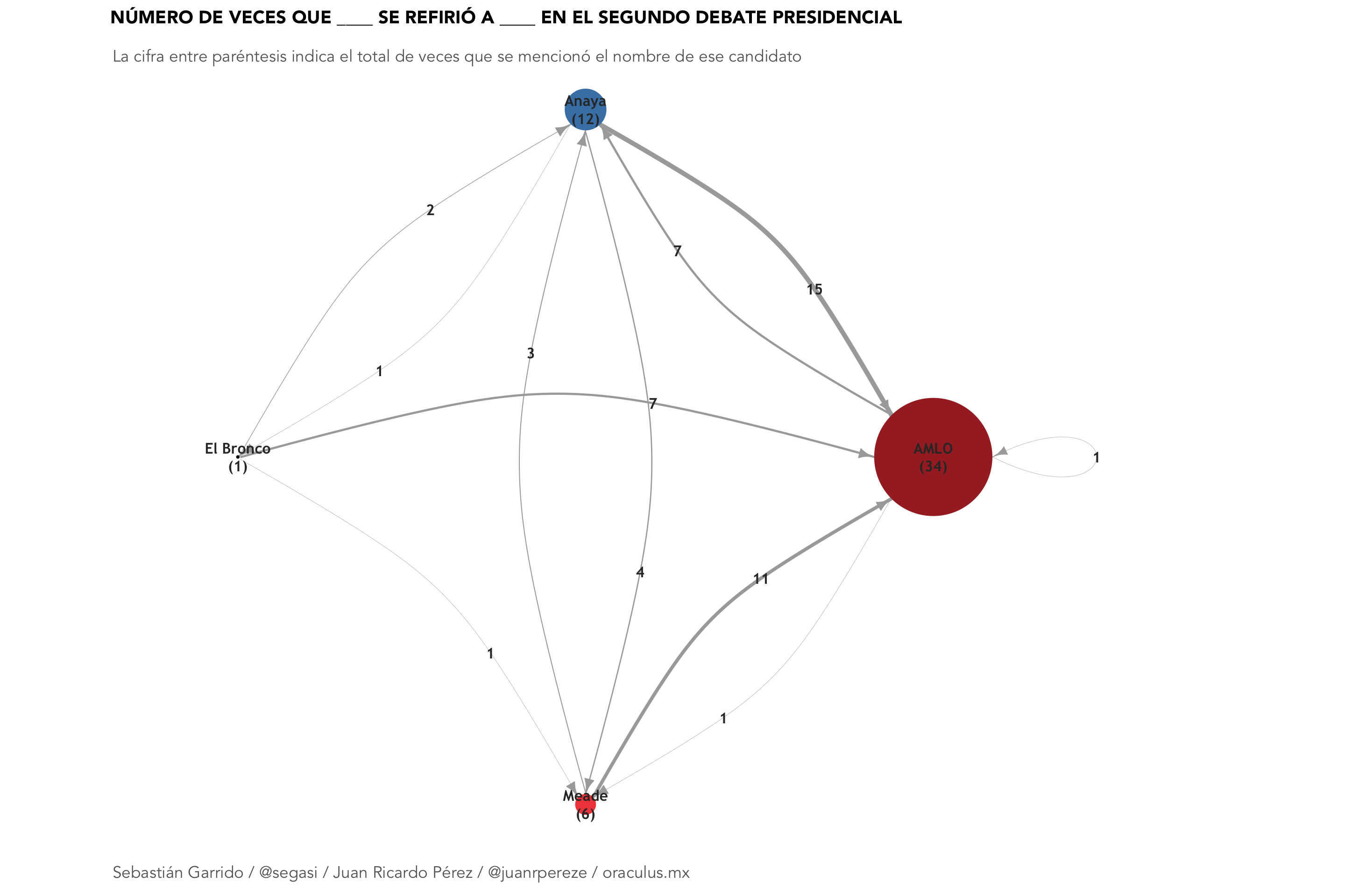 Mientras que en el primer debate tanto Anaya como Meade mencionaron a AMLO en 21 ocasiones, en el segundo estas cifras disminuyeron a 15 y 11, respectivamente. En contraste, si bien en el primer debate Anaya mencionó a Meade en dos ocasiones y este último al panista en una, en el segundo debate Anaya mencionó cuatro veces a Meade y este le respondió con tres menciones.
